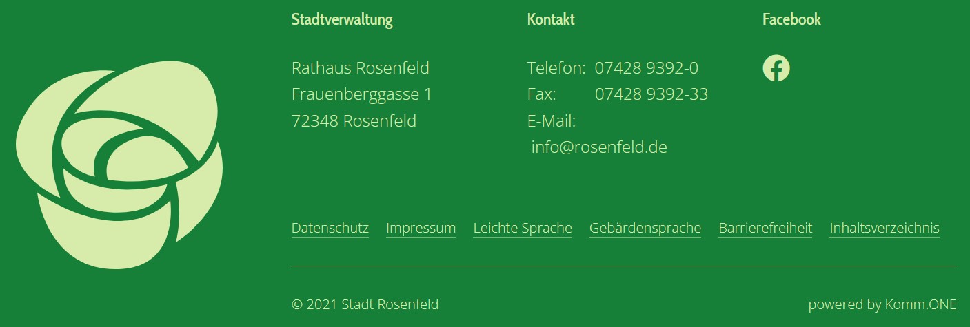 Auf jeder Seite steht ganz unten der Kontakt der Stadtverwaltung Rosenfeld.